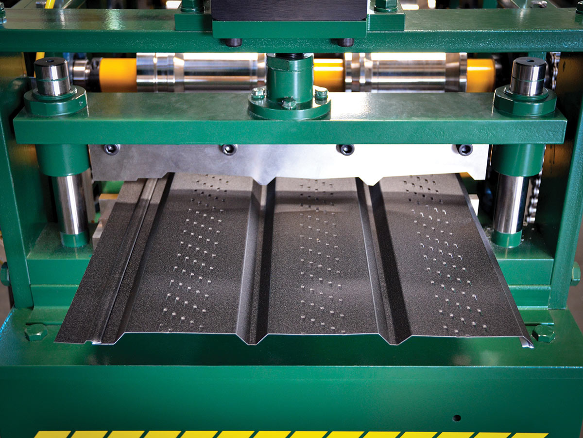 It can run solid or with full perforation. All forming dies are D2 tool steel and can be set up to your specifics. Available in electric, hydraulic, or mechanical.