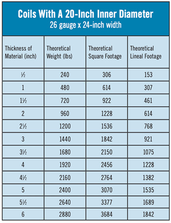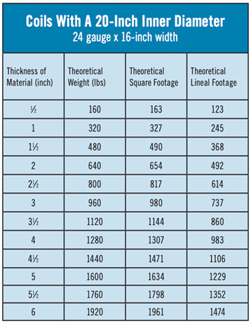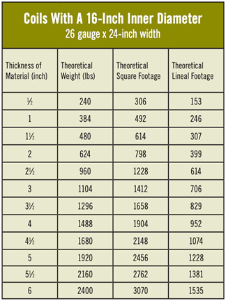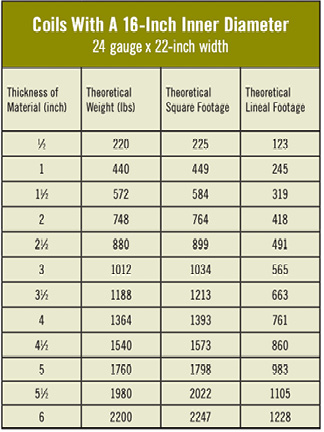 The charts include many of the standard gauges and coil widths used in our industry. The calculations were based on the theoretical multipliers and are medians. The multipliers will vary with each individual coil, and the numbers listed should be used as a point of reference and an estimate.