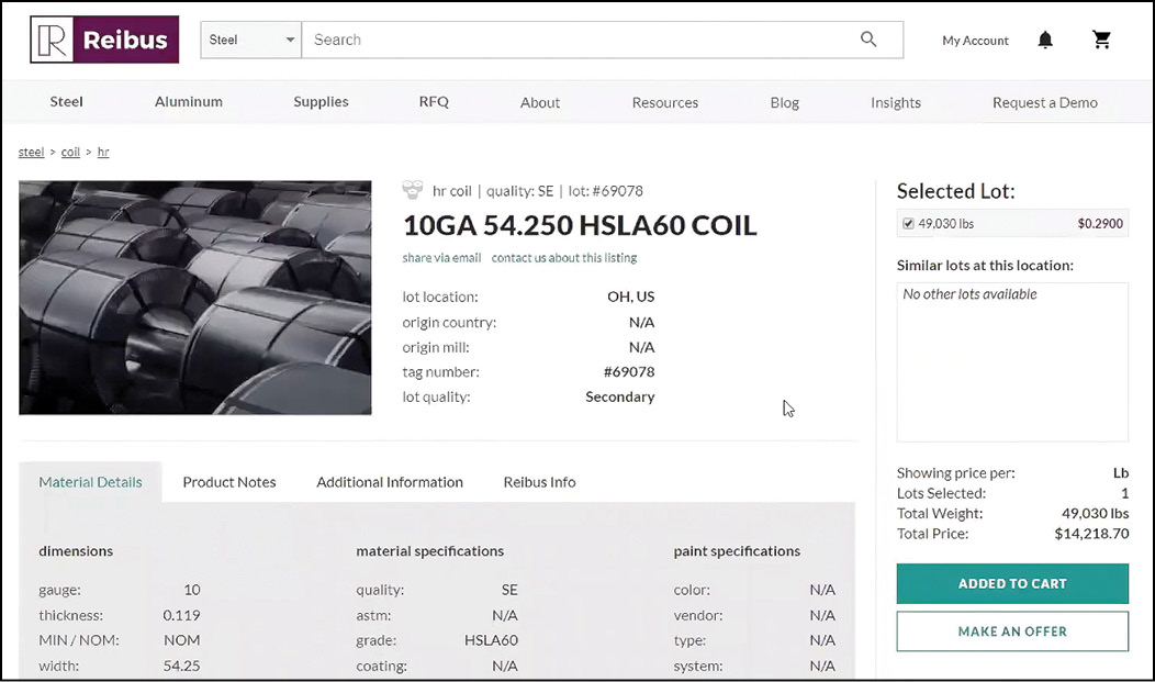 Leveraging the technology that already exists in the consumer channel makes the actual process simple. A dashboard of information is offered to a potential buyer, including price and specification data needed to make an immediate buying decision. Buyers are able to make an offer on any item they have interest in and the seller has the ability to accept or counter that offer. While buyers and sellers remain anonymous, mill certification stays with the metal, assuring that the mill warranty is passed on to the buyer.