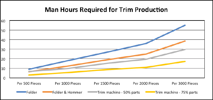 - This is an example of the average time it takes to produce 500-3,000 pieces of trim with various equipment; folder, hemmer and trim machines.